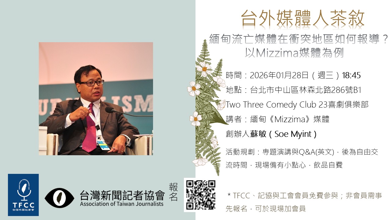 台外媒體人茶敘-01/28 蘇敏Soe Myint「緬甸流亡媒體在衝突地區如何報導?以Mizzima媒體為例」
